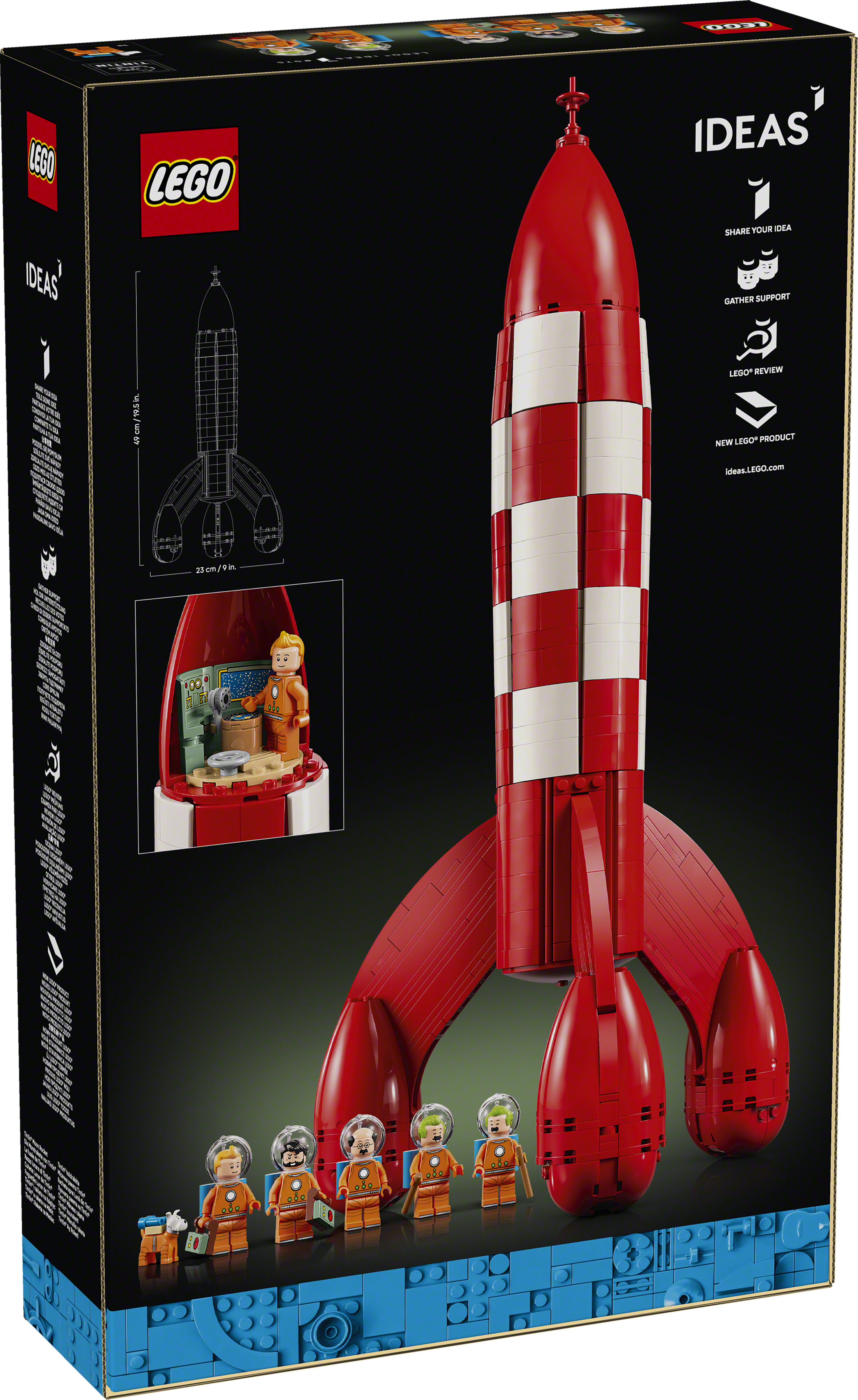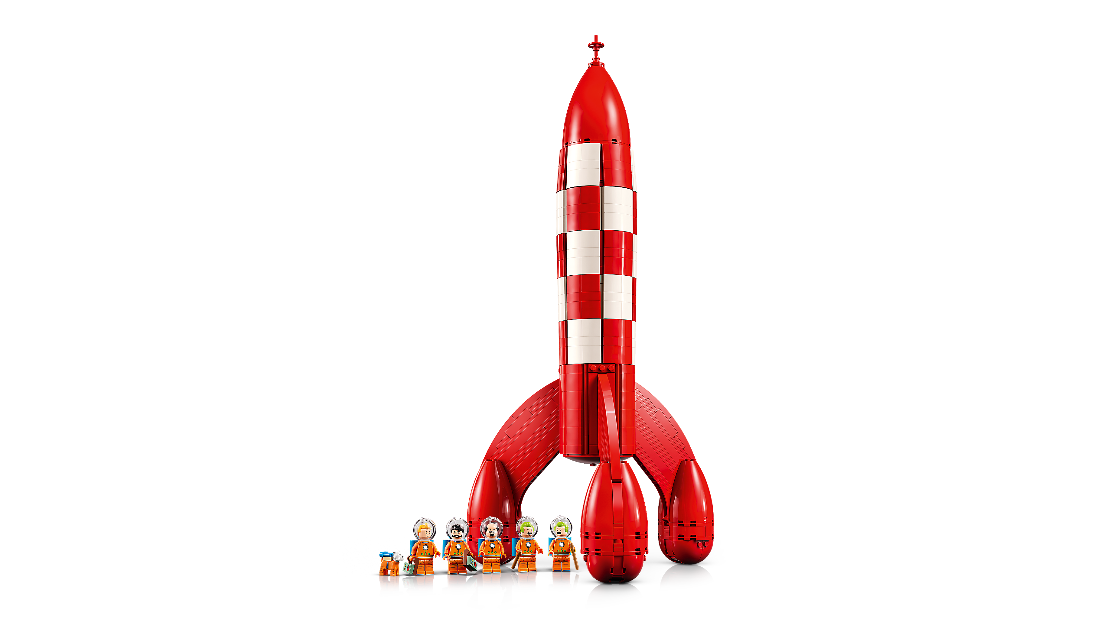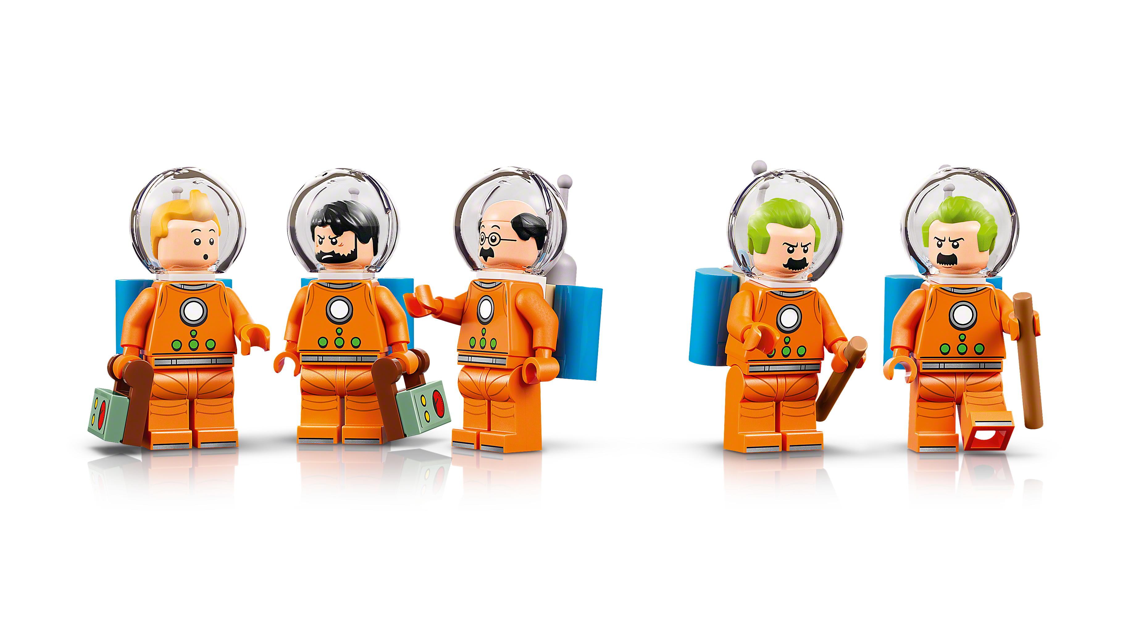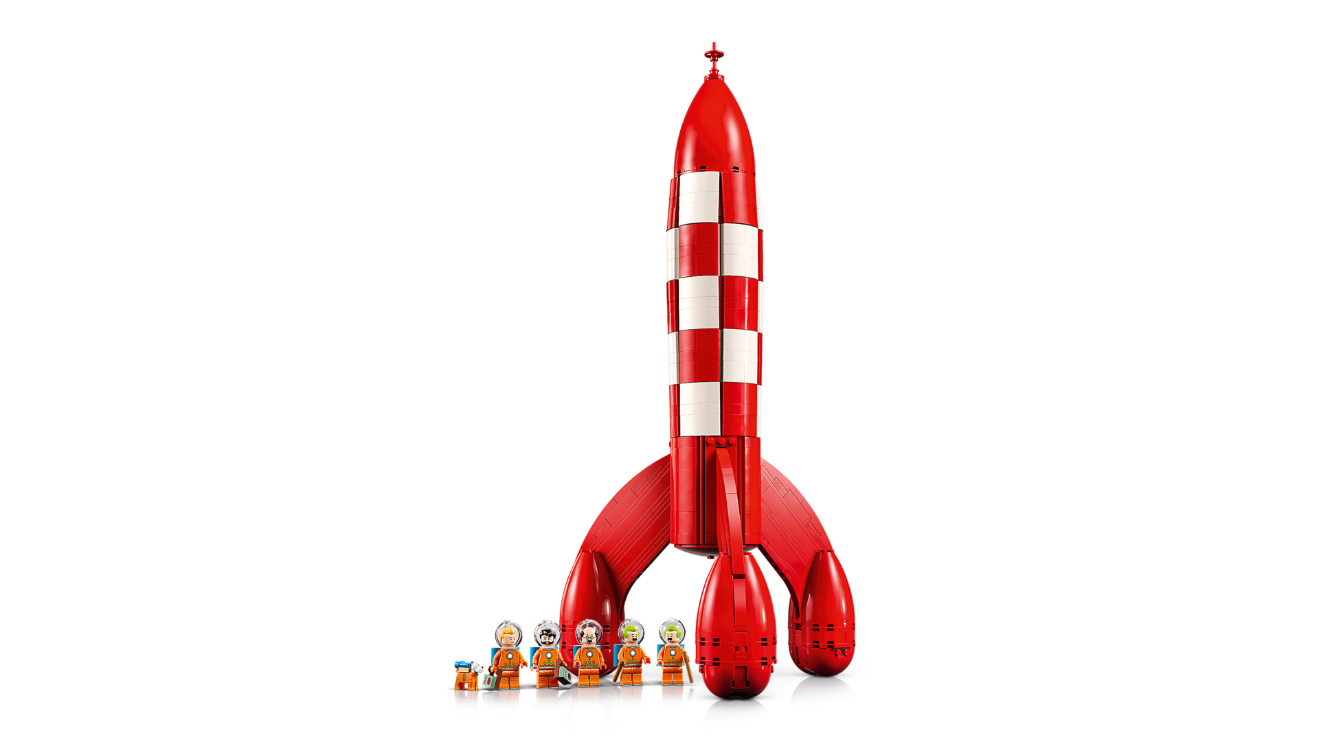 Das Set beinhaltet sechs Charaktere: Tim, Kapitän Haddock, Professor Bienlein, Schulze und Schultze – alle in detailgetreuen Mondanzügen mit Helmen und Sauerstofftanks – plus eine Struppi Figur. Um einen ikonischen Moment der Comics nachzustellen, können Fans die obere Verkleidung der Raketenkuppel abnehmen. Dort kommt ein verstecktes Detail zum Vorschein: ein kleiner Kontrollraum. Hier findet eine Minifigur Platz, um den überwältigenden Ausblick auf die ferne Erde zu bestaunen.